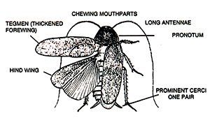 A relatively large cockroach, the adults are dark brown to almost black with no yellow markings. It prefers food of plant origin and is often a pest of green houses, nurseries, and gardens. It is regarded as an outdoor species. It can be found in garages, sheds and some sub floor areas.